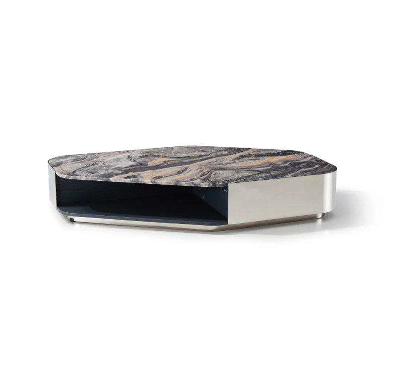 A geometric coffee table with a polished gray, black, and white stone top, set on a matte dark base with open shelving. Bold, modern, and sculptural.