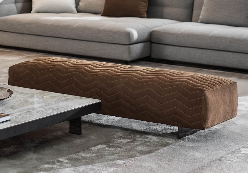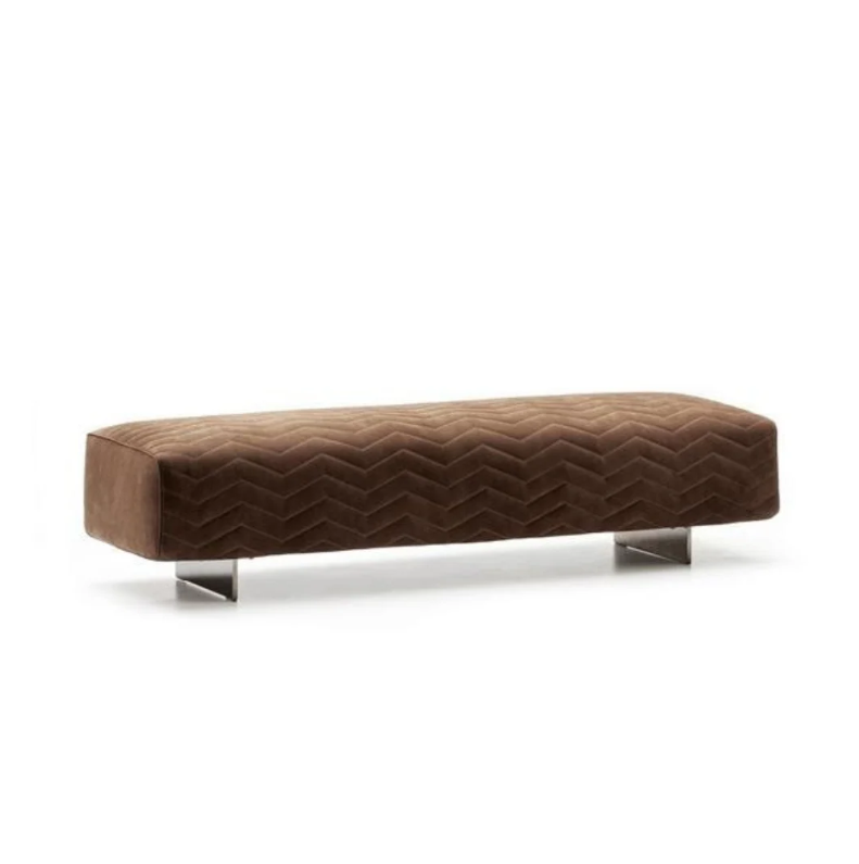Brown suede bench with a chevron-stitched cushion and slim metal legs. Its floating design and textured surface offer a refined, modern edge.